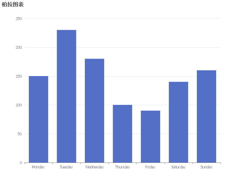 柏拉图表是一种数据分布图,通过数据条的长度表示各个数据值大小,非常直观。下面我们通过一个echart示例数据进行数据分析,展示用户点击数在一周内的分布情况: